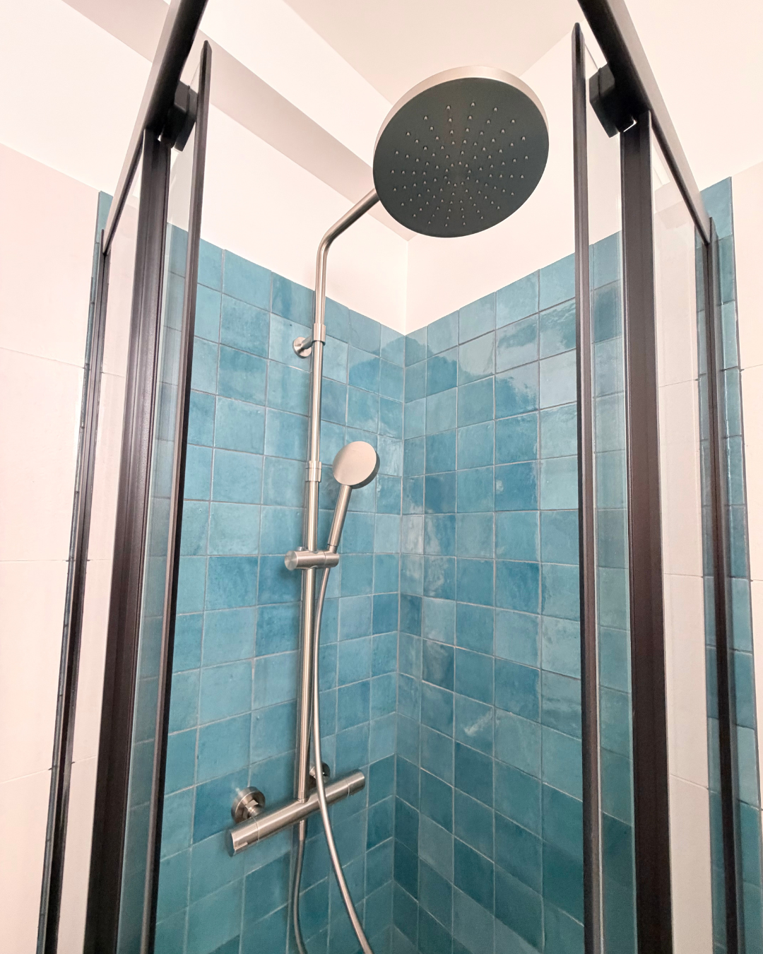 - L’installation d’une colonne de douche avec mitigeur thermostatique Alterna – Gamme Concerto 4 – Teinte Inox brossé